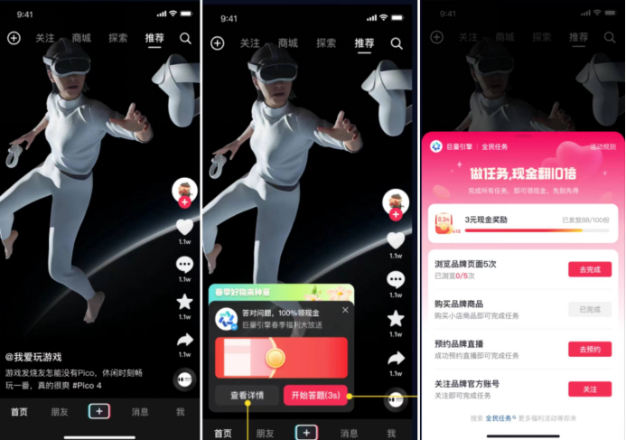 在產(chǎn)品價(jià)值的深度種草上,“答題種草”是一種新解法:在種草視頻講解過(guò)程中,前置答題/競(jìng)猜活動(dòng)利益點(diǎn),激發(fā)用戶互動(dòng);品牌設(shè)定的問(wèn)題,可與種草素材深度綁定,突出產(chǎn)品賣點(diǎn)和價(jià)值;答題互動(dòng)后,用戶即有機(jī)會(huì)獲得激勵(lì),完成品牌額外定制任務(wù),讓現(xiàn)金獎(jiǎng)勵(lì)膨脹10倍。