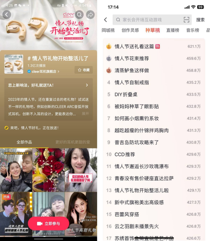 在情人節(jié)期間,Cleer耳機(jī)打造#情人節(jié)開(kāi)始整活了#熱點(diǎn)話題營(yíng)銷,帶動(dòng)不同層級(jí)的達(dá)人共創(chuàng)內(nèi)容,形成高熱話題,鼓勵(lì)用戶一起來(lái)“接梗”“玩?!?#xff0c;在全民“追熱點(diǎn)”的過(guò)程中,全面引爆了品牌種草熱度。數(shù)據(jù)顯示,話題最終登陸種草榜13位,曝光達(dá)1.3億。