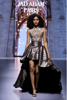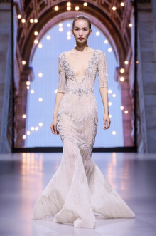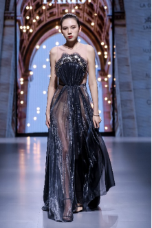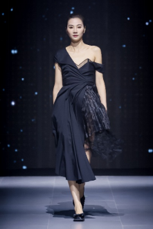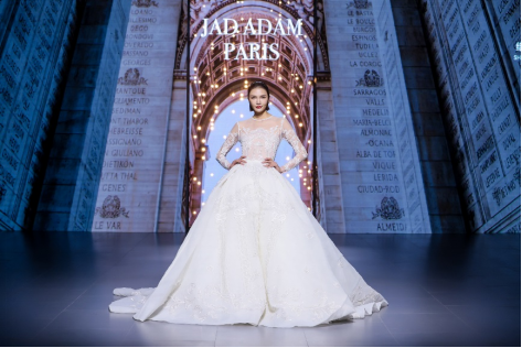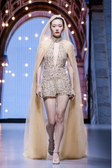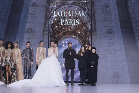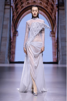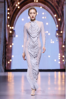 在充滿異域風情的“巴爾米拉女王”主題發(fā)布中,法國高定女裝設計師JadAdam攜手紹興永耀紡織品有限公司、紹興晶遠創(chuàng)意設計有限公司展現(xiàn)了尋找內心平靜的啟蒙之旅的獨特過程。設計師從柯橋優(yōu)秀的面料中獲得啟發(fā),在華麗的禮服裙中采用了大量的刺繡及繡片繡珠工藝。兩家企業(yè)提供的閃光高密度歐根紗、銀色金屬絲、清透網眼等面料,花型立體簡潔、色彩透亮多變,為設計師帶來了豐富的靈感。從晚禮服、婚紗到高級時裝,JadAdam通過特有的藝術表現(xiàn)手法詮釋了本次禮服設計。