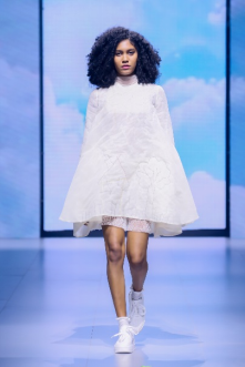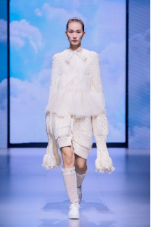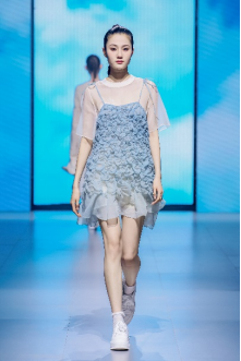 在“童年”主題秀演中,法國設計師聯(lián)袂浙江懿紗紡織科技有限公司、紹興柯橋豐旺紡織品有限公司,圍繞兒童的藝術、回到學校、童年的回憶三個子主題,共同演繹了童年的懷舊故事。設計師以精細的絎縫、印染、明線縫紉及自然著色的效果制作服裝和圖案,在工藝上采用了法國特有的編織技術,并結合WALTZ系列花紗、三醋酸、錦滌歐根紗、六角硬網等面料輕薄有型、色彩飽滿的特色,最大程度實現(xiàn)了紡織工藝的價值化。特別是在傳統(tǒng)手工藝非遺、生態(tài)環(huán)保材料等系列元素的加持下,為整場秀演增添了可持續(xù)時尚的價值。