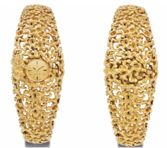 兩位著名的珠寶藝術(shù)大師Gilbert Albert和Andrew Grima于六、七十年與歐米茄緊密合作,創(chuàng)造出很多傳世佳品,也備受收藏家的青睞。其中Gilbert Albert設(shè)計(jì)制作的18K金鑲鉆石鏈帶腕表在2021年佳士得拍得25萬港幣。另一款是承襲Andrew Grima設(shè)計(jì)風(fēng)格的歐米茄碟飛“Jeux d‘Argent”銀質(zhì)腕表則在富藝斯拍得近2萬瑞郎。