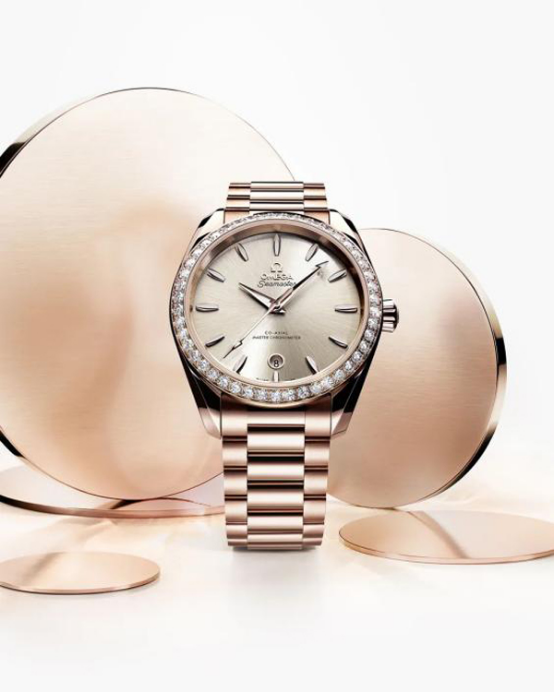 當(dāng)然,對(duì)于想要在基礎(chǔ)款式之上展露更多個(gè)人特色的女生來說,足夠特別才足夠令人喜歡。Aqua Terra Shades腕表有一款38毫米的全金腕表,采用歐米茄獨(dú)家研發(fā)的Sedna 18K金打造而成,這一獨(dú)特的紅色18K金色澤雅致,且不易褪色。表圈鑲飾46顆閃耀美鉆,共1.77克拉。砂巖色表盤經(jīng)CVD技術(shù)打造,呈現(xiàn)出太陽射線的打磨效果。