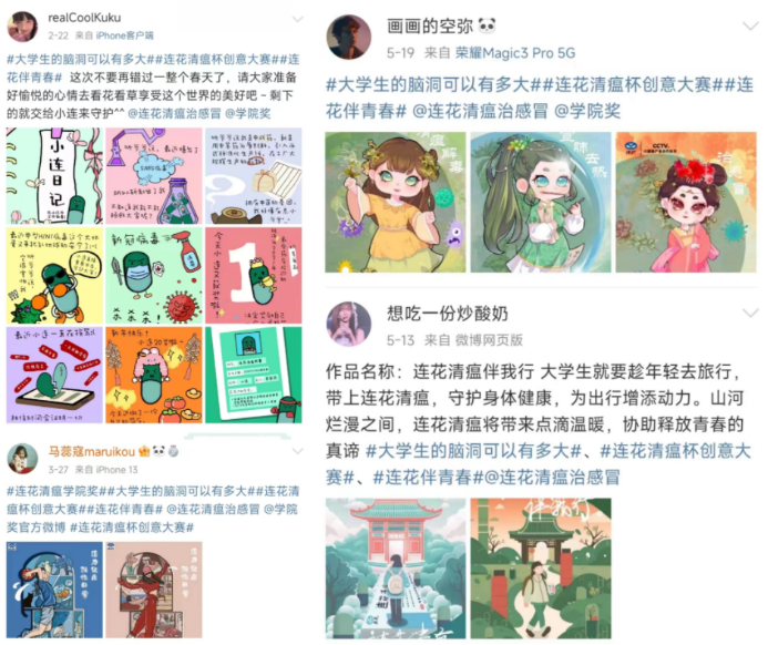 時代在發(fā)展,青年在進步,創(chuàng)作新勢力隨著青年一代的熱血成長也在持續(xù)擴大聲量,此次征集到的創(chuàng)意作品高燃展現(xiàn)了Z世代的創(chuàng)意腦洞,賦能連花清瘟無限青春力量。