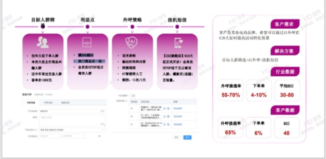 例如,今年618期間,慧博科技某美妝品牌客戶,基于慧博慧博云千載數(shù)據(jù)中臺(tái)監(jiān)測到最近上的新品下單的趨勢(shì)增強(qiáng),基于該部分興趣人群的篩選,通過618這個(gè)大促契機(jī),以“滿300減50 熱門商品買一送一”等利益點(diǎn)進(jìn)行智能AI外呼觸達(dá)+掛機(jī)短信提醒,下單率提升6%。