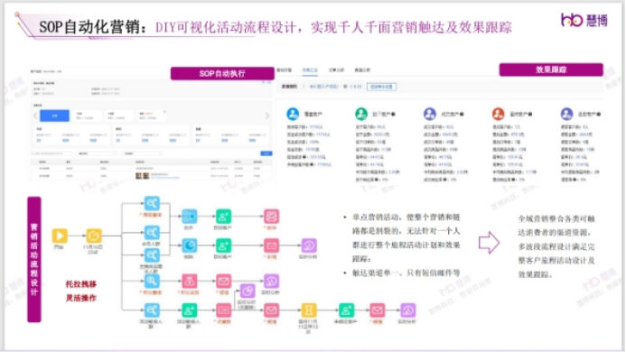 除了實(shí)現(xiàn)千人千面營銷觸達(dá)及效果跟蹤外,慧博云千載數(shù)據(jù)中臺(tái)還可以基于客戶分層,為不同標(biāo)簽的客戶制定不同的SOP,進(jìn)行觸達(dá)和營銷,提升運(yùn)營效率。