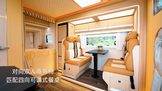 踏入房車內(nèi)部,菱形金絲縫線軟包車頂配合淺木紋飾面家具,目光所至,皆是精致歐系風尚,品味盡顯。寬敞舒適的空間布局,帶來家的溫馨氣息。廚房設備齊全,休閑區(qū)配備多人卡座、可升降桌臺、JBL揚聲器及智能網(wǎng)絡電視等,帶來美食+娛樂疊加的趣味。