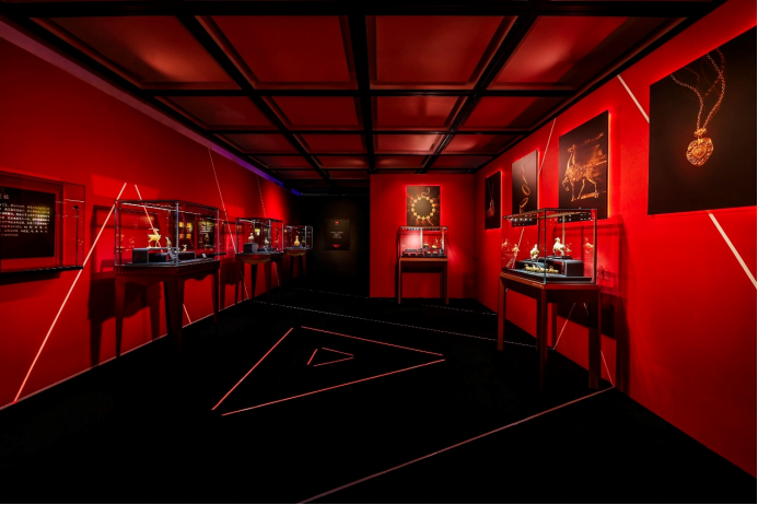 博大精深的中國傳統(tǒng)文化孕育出無限創(chuàng)造力和想象力,因此周大福珠寶集團在探索珠寶美學(xué)與中國傳統(tǒng)文化相結(jié)合的過程中不斷推陳出新,呈獻許多匠心獨運的藝術(shù)臻品——標志性的周大福傳承系列作品。此次GOLD IS CHIC鎏光時代·周大福傳承系列黃金美學(xué)藝術(shù)展跨越時空界限,將蘊含歷史、文化的黃金美學(xué)呈現(xiàn)到大眾視野中,全方面展現(xiàn)黃金珠寶設(shè)計背后的時尚創(chuàng)意靈感、精益求精的工藝和具有東方韻味的藝術(shù)美學(xué)理念。此次展覽的空間設(shè)計從周大福傳承系列視覺大片中汲取靈感,衍生出紅黑金三色、光影不斷變換、又極富想象力的三個空間,以創(chuàng)新的藝術(shù)視角展現(xiàn)品牌具有中國傳統(tǒng)文化內(nèi)涵的時尚潮流形象。置身于展覽空間,映入眼簾的是霓虹線條與迷離燈光相互交織而成的“時光隧道”,使人仿佛置身于過去與未來的交界地。光影流動的變幻間,映照出品牌歷經(jīng)歲月沉淀后的璀璨輝煌,這意味著品牌正開啟黃金世代的嶄新篇章。