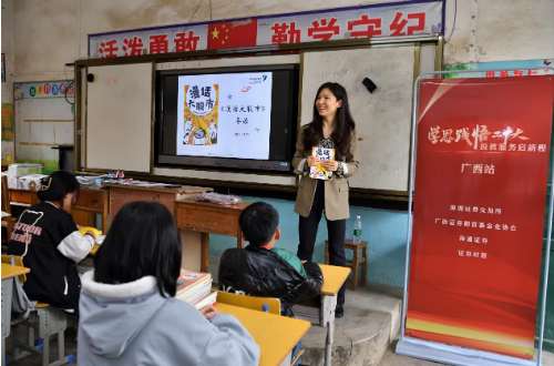 4月25日下午,“學(xué)思踐悟二十大 投教服務(wù)校園行”在浦北縣三合鎮(zhèn)橋頭小學(xué)開(kāi)展。深交所、海通證券投教基地的專業(yè)人員深入各個(gè)班級(jí)進(jìn)行少兒財(cái)商授課,借助由深交所投資者服務(wù)部編著的《漫話大股市》,將專業(yè)的財(cái)經(jīng)內(nèi)容以通俗易懂的圖文形式傳授給小朋友們?!肮镜降资鞘裁?”“公司上市又是什么?”“有限責(zé)任公司與股份有限公司的區(qū)別在哪?”……一顆顆財(cái)商的種子在孩子們的心中生根發(fā)芽。
