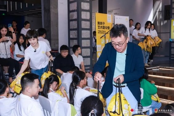 ▲李宇春、劉小東、喻紅向參加夏令營活動的師生發(fā)放藝術(shù)夢想包