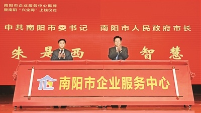 南陽市委書記朱是西(右)、市長王智慧(左)為南陽市企業(yè)服務中心揭牌