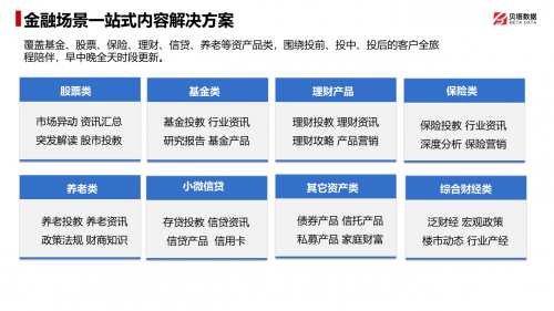 貝塔數(shù)據(jù)針對金融場景提供了一站式的內(nèi)容解決方案,覆蓋基金、股票、保險、理財、信貸、養(yǎng)老等不同資產(chǎn)類別,并以投前、投中、投后的全過程為核心,為金融機(jī)構(gòu)提供全面的客戶陪伴服務(wù)。