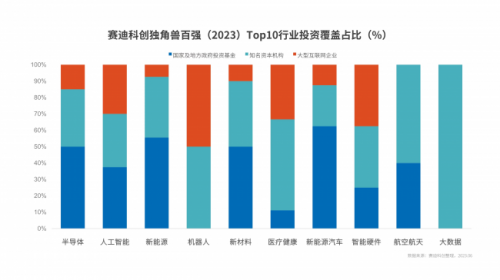 賽迪科創(chuàng)獨(dú)角獸百?gòu)?qiáng)(2023)中,獨(dú)角獸企業(yè)與國(guó)家及地方政府基金、知名資本機(jī)構(gòu)、大型互聯(lián)網(wǎng)企業(yè)投資關(guān)聯(lián)度達(dá)到93%,分別投資覆蓋(含重復(fù))了69家、65家、35家獨(dú)角獸百?gòu)?qiáng),初步形成“知名資本+大型互聯(lián)網(wǎng)企業(yè)+政府投資”三方格局。其中,新能源汽車、新能源、半導(dǎo)體和新材料行業(yè)政府基金投資覆蓋均超過(guò)50%,成為最受關(guān)注的賽道。