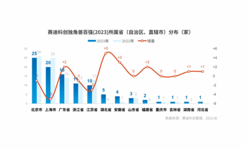 省域?qū)用?#xff0c;北京、上海、廣東、浙江、江蘇位列前五,分別上榜25家、20家、16家、11家、10家,浙江反超江蘇升至第四位。從數(shù)量變化看,湖北構(gòu)建科創(chuàng)企業(yè)全生命周期培育體系成效初顯,上榜企業(yè)數(shù)量增長(zhǎng)5家,實(shí)現(xiàn)增幅領(lǐng)跑,安徽以政府投資引育戰(zhàn)略性新興產(chǎn)業(yè)的招引模式,凈增3家獨(dú)角獸百?gòu)?qiáng);上海上榜企業(yè)數(shù)量減少最多,達(dá)到5家,天津、四川、遼寧、江西則首次無(wú)企業(yè)入圍;河南、陜西等省份仍無(wú)緣百?gòu)?qiáng)榜單。