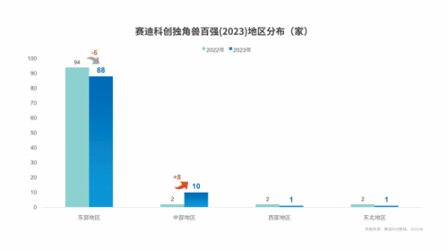 地區(qū)層面,賽迪科創(chuàng)獨(dú)角獸百?gòu)?qiáng)(2023)分布不平衡態(tài)勢(shì)依然突出,東部地區(qū)占88家,中部地區(qū)占10家、西部地區(qū)占1家,東北地區(qū)占1家,與上一年相比,中部地區(qū)增長(zhǎng)最多,增加8家,東部地區(qū)則有所降低,但仍處于絕對(duì)領(lǐng)先地位。