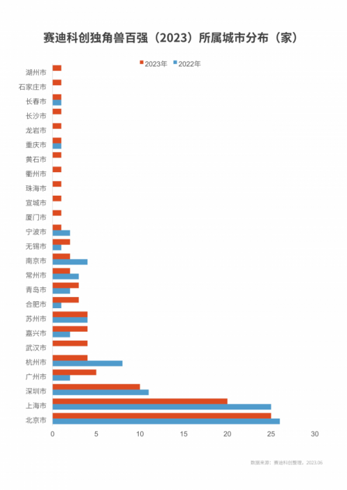 (二)城市格局:三強(qiáng)格局基本穩(wěn)固,兩家以上獨(dú)角獸百?gòu)?qiáng)城市再度擴(kuò)容
