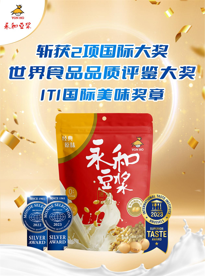 永和豆?jié){一路走來,不斷追求卓越品質(zhì),積極對標(biāo)嚴(yán)格的國際標(biāo)準(zhǔn),打造營養(yǎng)美味的豆?jié){產(chǎn)品。2022-2023年,永和豆?jié){旗下經(jīng)典原味豆?jié){粉350g憑借專業(yè)配方和匠心工藝,連續(xù)斬獲蒙特獎和ITI國際美味獎,閃耀世界舞臺。